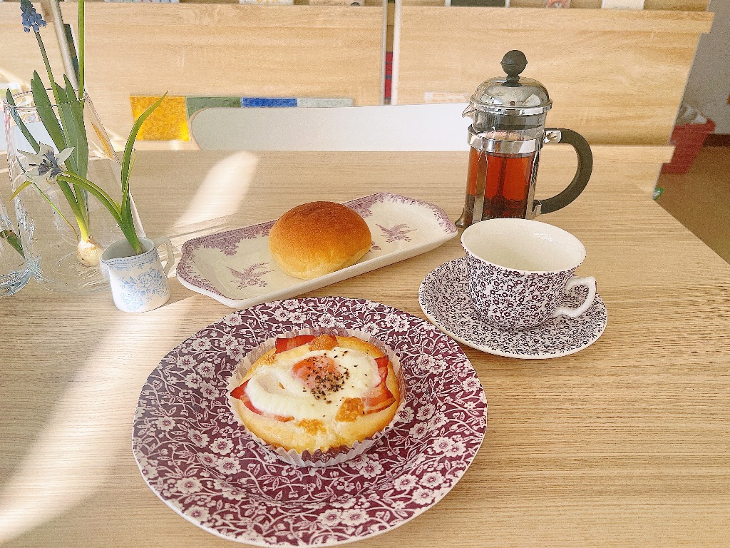 我孫子市若松のcotton fieldさんんへ。選んだのはベーコンエッグと「すごい!!クリームパン」です。私はどうも目玉焼きがのったパンに目がない♡ようで、ついつい目玉焼きにトングが伸びます。