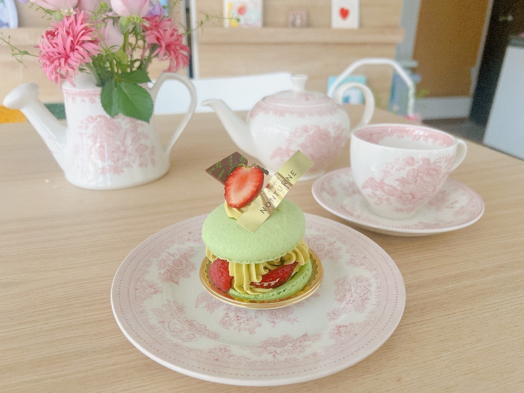 大きなマカロンに濃厚なピスタチオのクリームといちごの爽やかな酸味がアクセントに!